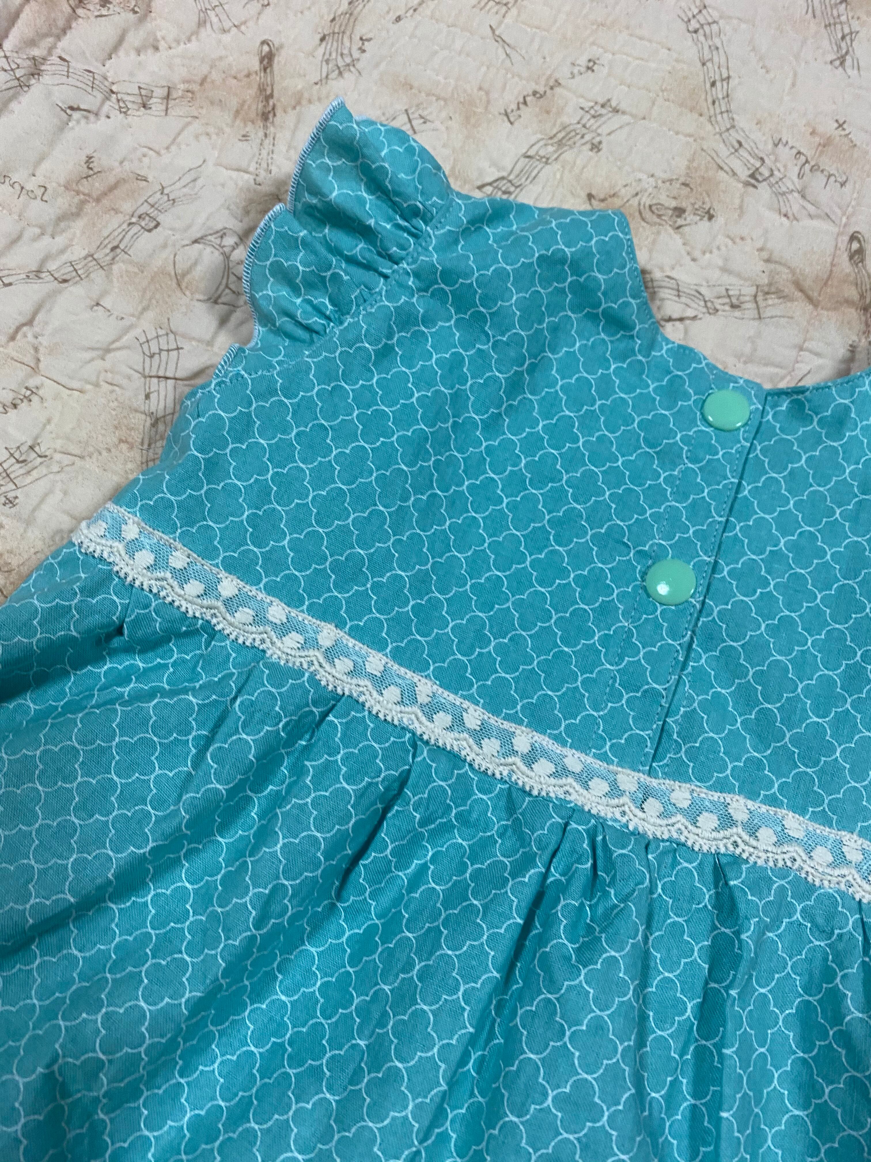 ワンピースです。生地は綿素材を使用です。色は写真では水色のようにも見えますが濃いミントグリーンです。切り返しの部分にレースリボンをつけました。